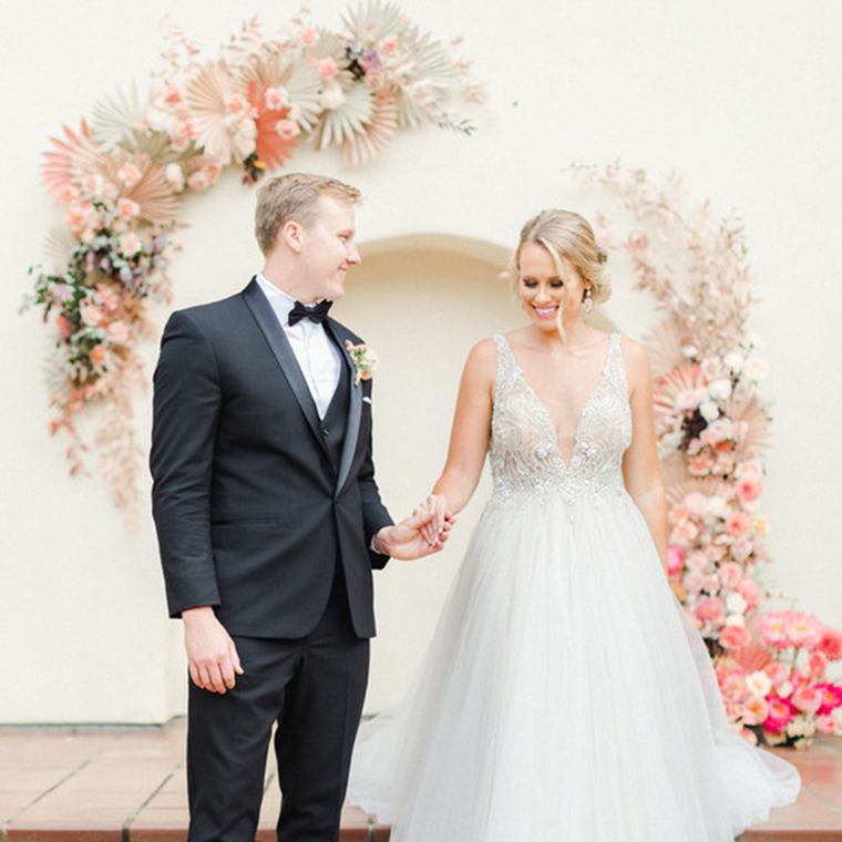 Kayla of Simply Gorgeous Events says, When dreaming up this shoot, I had a vision of a perfect summer evening wedding. My goal was to create a sophisticated and classic look rather than a bohemian vibe that bright colors can sometimes bring. The Estancia La Jolla Hotel & Spa was the perfect backdrop for this shoot with it’s beautiful courtyard and lawn space. The venue feels romantic and classy from the moment you walk through the doors, and I wanted to create a wedding that felt the same. For the ceremony, I was inspired by the courtyard white wall on the staircase. I loved the idea of our couple being slightly elevated above the guests, and envisioned a beautiful installation as a backdrop. Obviously, Kim of The Dainty Lion took my vision to an entirely new level as she created one of the most gorgeous wall installations I’ve seen!