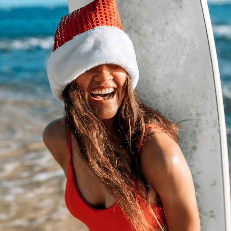 - You will see Santa hats on the islands, but he will not be arriving in the skies with reindeer. In Hawaii, Santa appears on an outrigger canoe pulled by dolphins. Although it’s rare to see Santa’s dolphins in action, you will see Santa roaming the beaches with his Hawaiian-print swim trunks belting out his joyous – ho, ho, ho!