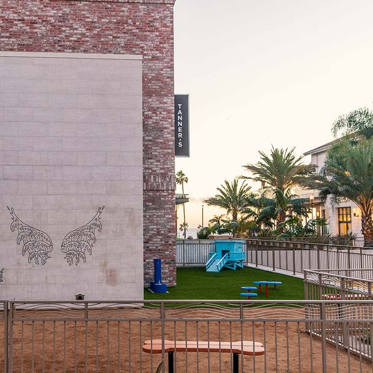 Huntington Beach, CA. (September 26, 2018) – Paséa Hotel & Spa is soon to unveil a new interactive pup play park, The PAW-SÉA, to add to its repertoire of luxe pet friendly hotel amenities. This December 2nd guests of the hotel will be able to play with their furry companions in a brand new 1,100 square foot outdoor pup play area outfitted with a lifeguard station dog house, a local artist commissioned wall mural featuring dog angel wings for coveted Instagram travel photos, and all the space a vacationing four-legged friend could want. The play park is a fenced-in area where dogs can be off-leash and will only be accessible to pets registered with the hotel. The Pawséa pup park is a growing part of the hotel’s pet friendly travel program that includes in-room bed, food and water bowls, a dog treat welcome amenity, pet gift shop items, and Lago, Paséa’s French bulldog pet concierge.